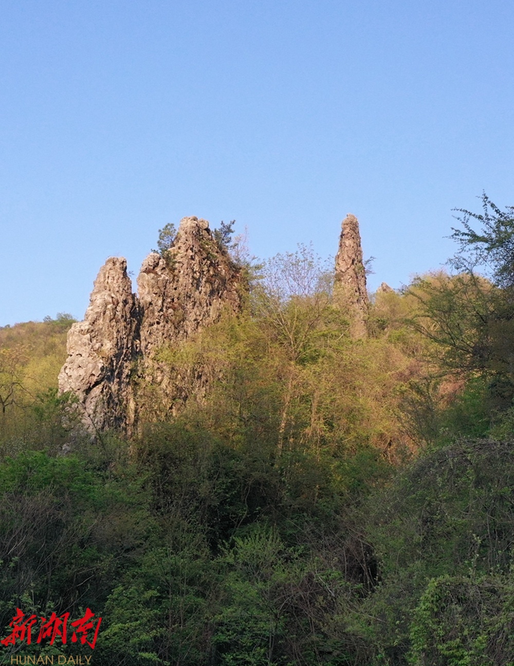 经亿万年鬼斧神工打磨、雕刻而成的奇异景观——板壁岩,高100多米,厚2至5米,长约200米。有游客说它更像龙脊上的鳍,也称“龙鳍岩”。晨光下的“龙鳍岩”呈现夺目的金色。