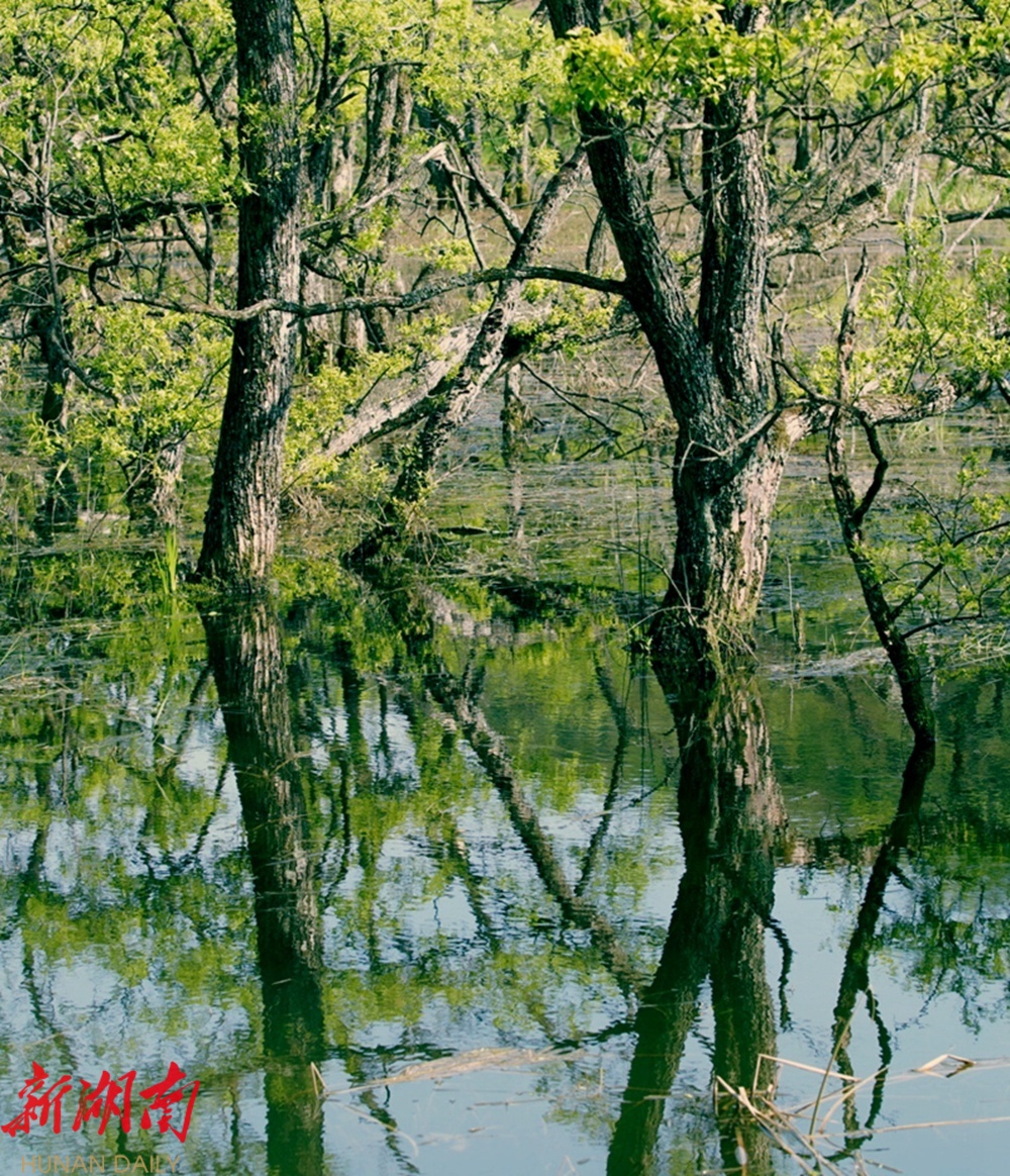 尼尔湖,海拔1100米,水深两米,虽然看不见明显的水源,但一年四季从未干涸过。湖中的水杨树龙骨虬枝,苍劲挺拔,傲然不屈。
