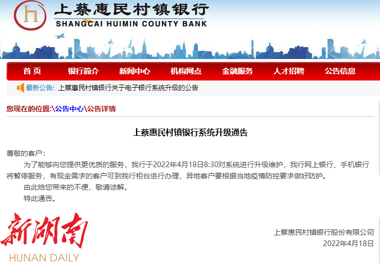 上蔡惠民村镇银行的通告。图片来源于该行官网截图