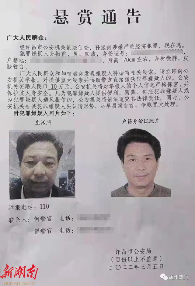 3月5日许昌市公安局发布的《悬赏通告》显示,“经许昌市公安机关依法侦查,孙振甫涉嫌严重经济犯罪,现在逃。”通告称,对提供重大线索并协助警方抓获犯罪嫌疑人的,公安机关奖励人民币10万元。