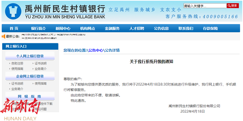 禹州新民生村镇银行的通知。图片来源于该行官网截图