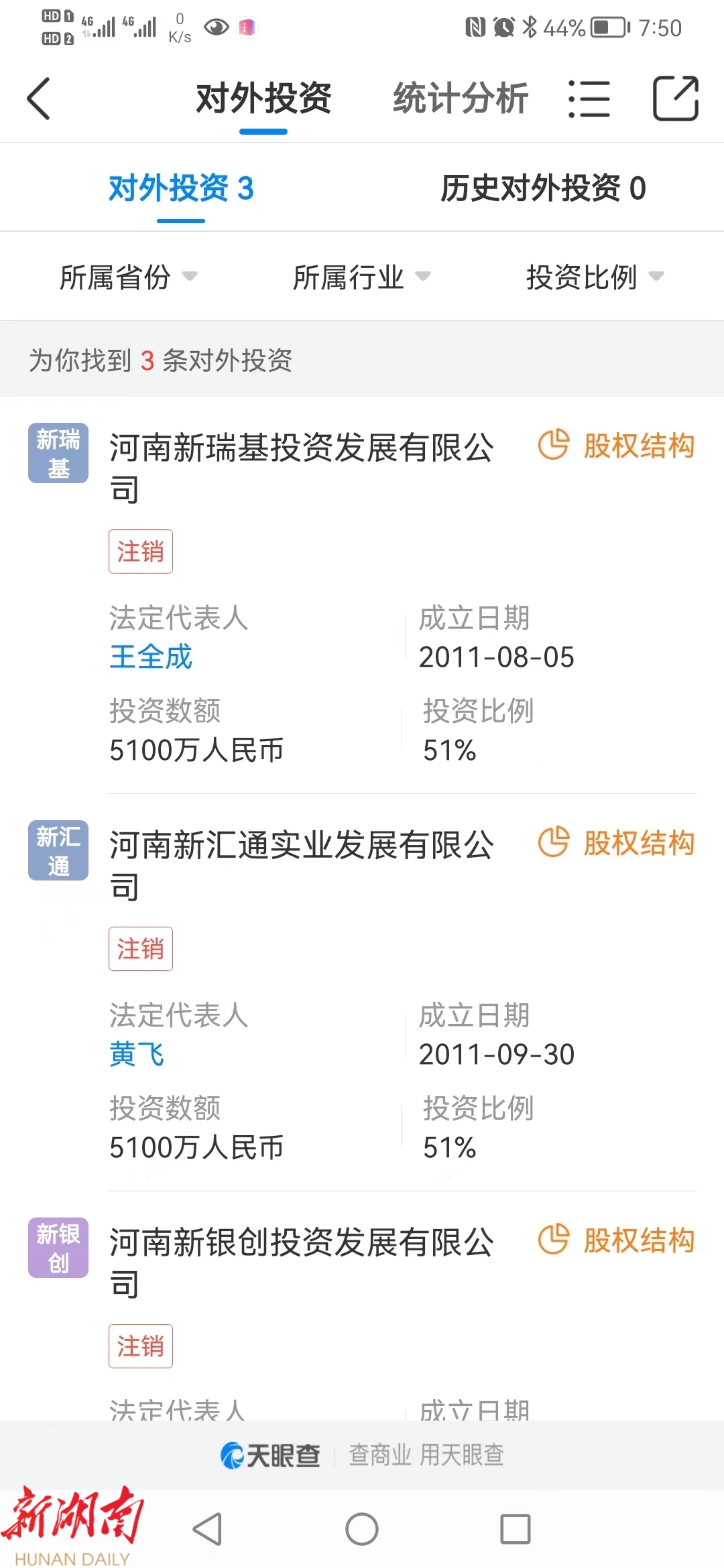在对外投资方面,河南新财富集团是三家企业的大股东,持股均为51%。这三家企业是:河南新瑞基投资发展公司、河南新汇通实业发展公司、河南新银创投资发展公司。