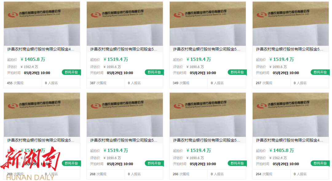 上述8条拍卖信息目前已出现在互联网拍卖平台,拍卖的许昌农商行股金共计4200万股,评估价合计 1.3亿余元,起拍价合计约1.19亿元。拍卖时间为5月29日至30日。