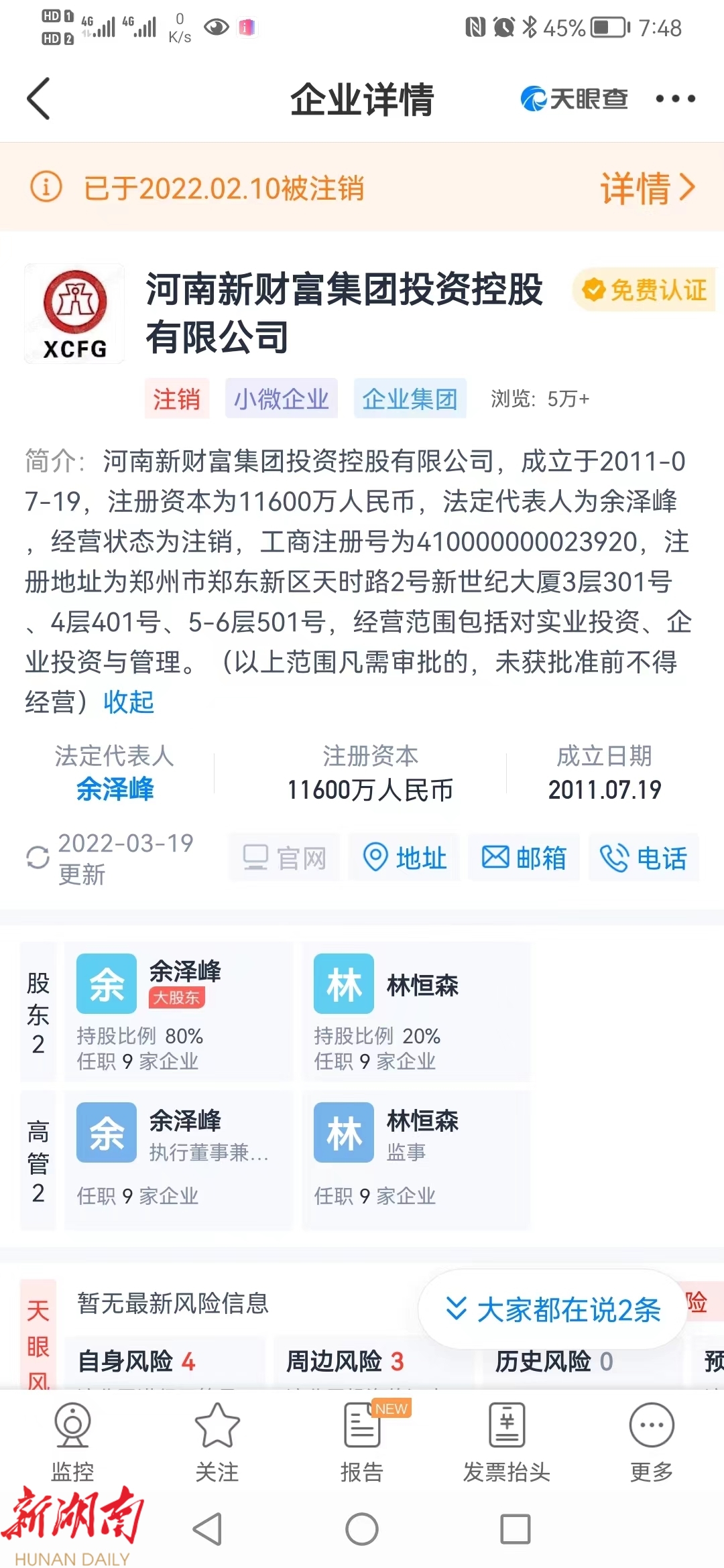 工商信息显示,河南新财富集团成立于2011年,注册地址为郑州市郑东新区,注册资本11600万元,经营范围是“对实业投资、企业投资与管理”。该公司股东有两人,分别是持股80%的余泽峰、持股20%的林恒森。