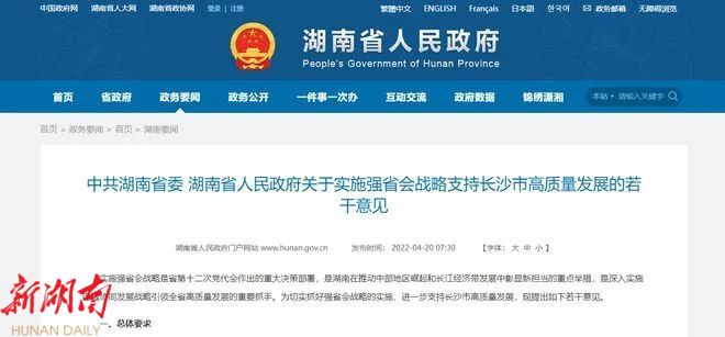 湖南省委、省政府印发《关于实施强省会战略支持长沙市高质量发展的若干意见》截图