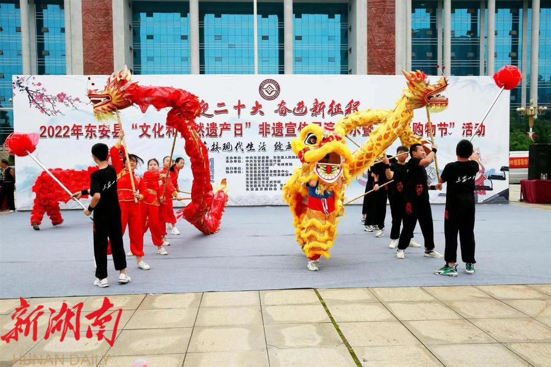 新湖南客户端6月11日讯(通讯员 张华丽)6月10日,东安县"文化自然遗产日"非遗宣传展演活动在和谐广场隆重举行。东安一小舞龙舞狮社团在展演活动上表演了开场节目,获得观众一致好评。
