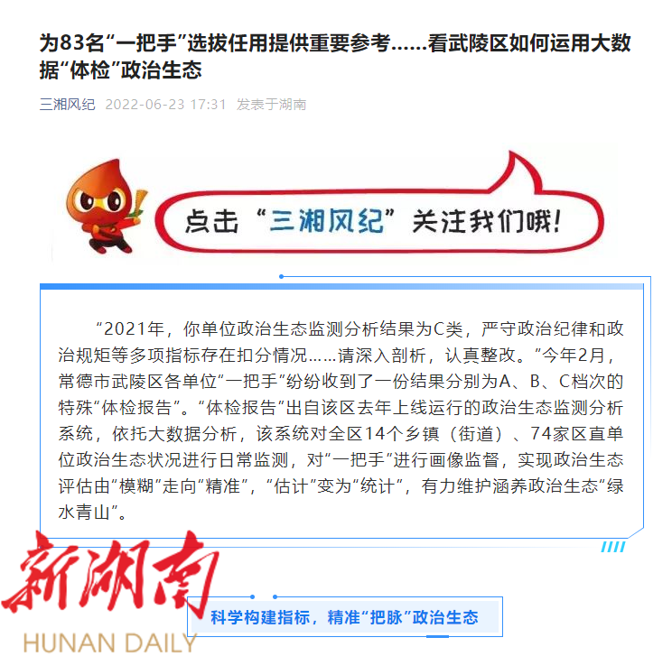 近日,武陵区如何运用大数据“体检”政治生态,获“三湘风纪”点赞。
