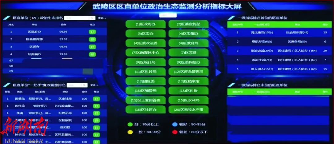 “我们可以通过‘颜色地图’很清晰地查看监测对象总体评价情况,好、较好、一般、较差四个评定等次分别对应绿、蓝、黄、红四种颜色,通过‘互联网+’科技手段实现前端录入、后台汇总、自动预警、一键排名等功能。”武陵区纪委监委一名工作人员登录该区政治生态监测分析平台后介绍道。