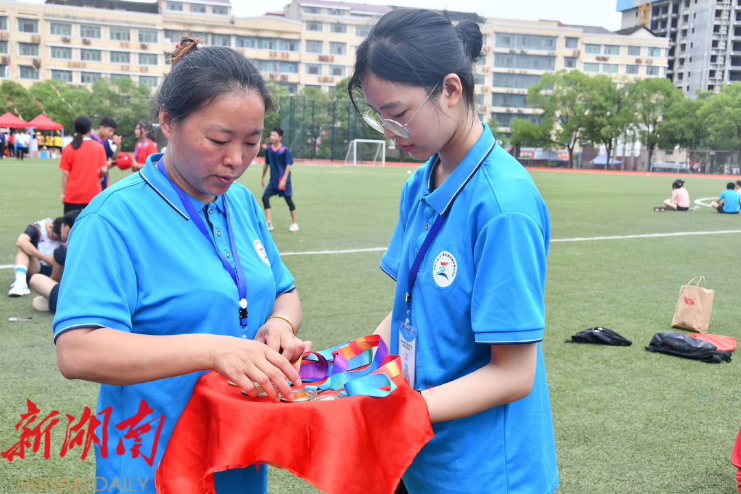 在新邵一中板鞋项目比赛现场,来自绥宁代表团15岁的选手周晓涵,因训练时不慎摔伤了膝盖,但她还是坚持带伤比赛。比赛现场的志愿者,对她进行一对一的服务,随时了解她的需求,时刻关注她的伤势,并给她加油鼓劲。最终在板鞋女子甲组60米比赛中,周晓涵和她的队友获得了第二名的好成绩。