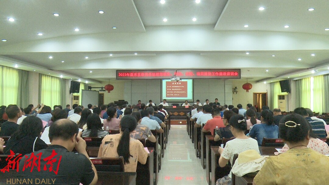 会议通报了我县今年教育项目建设的进展情况;组织学习了《全省基础教育领域违纪违法典型案例警示录》;宣读了《关于严肃全县招生工作纪律的重要通知》;嘉禾一中、珠泉完小、嘉禾五中分别作了工作发言,与会人员签署递交了承诺书。