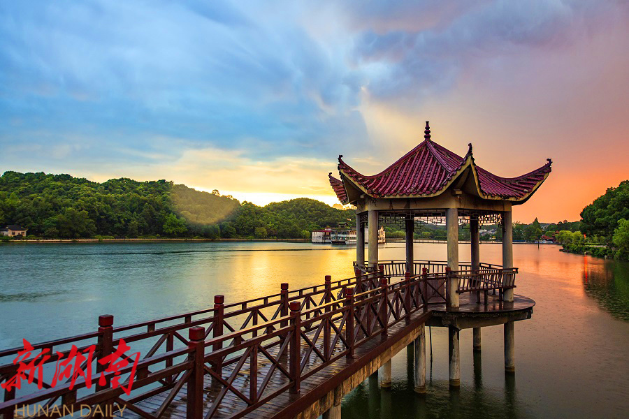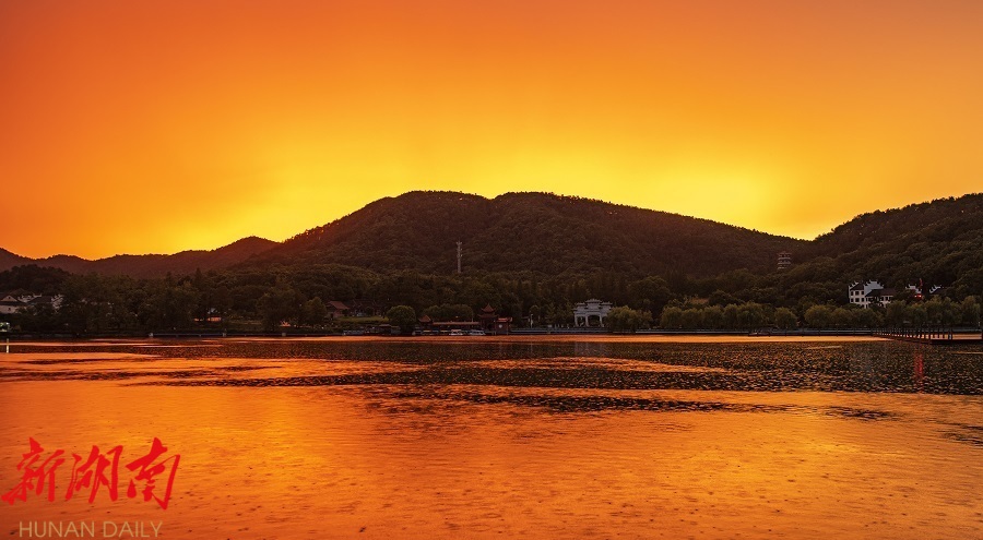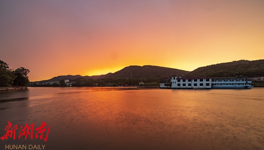 夕阳落下,激起漫天晚霞,把江面染成一片橘红,闪耀着灿烂光辉。晚霞映夹山,风光美如画。今天的湖南石门小城美如仙境。