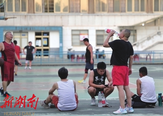 8月9日傍晚,长沙,中南大学铁道校区,打篮球的男子在补充水分。组图/记者吴琳红