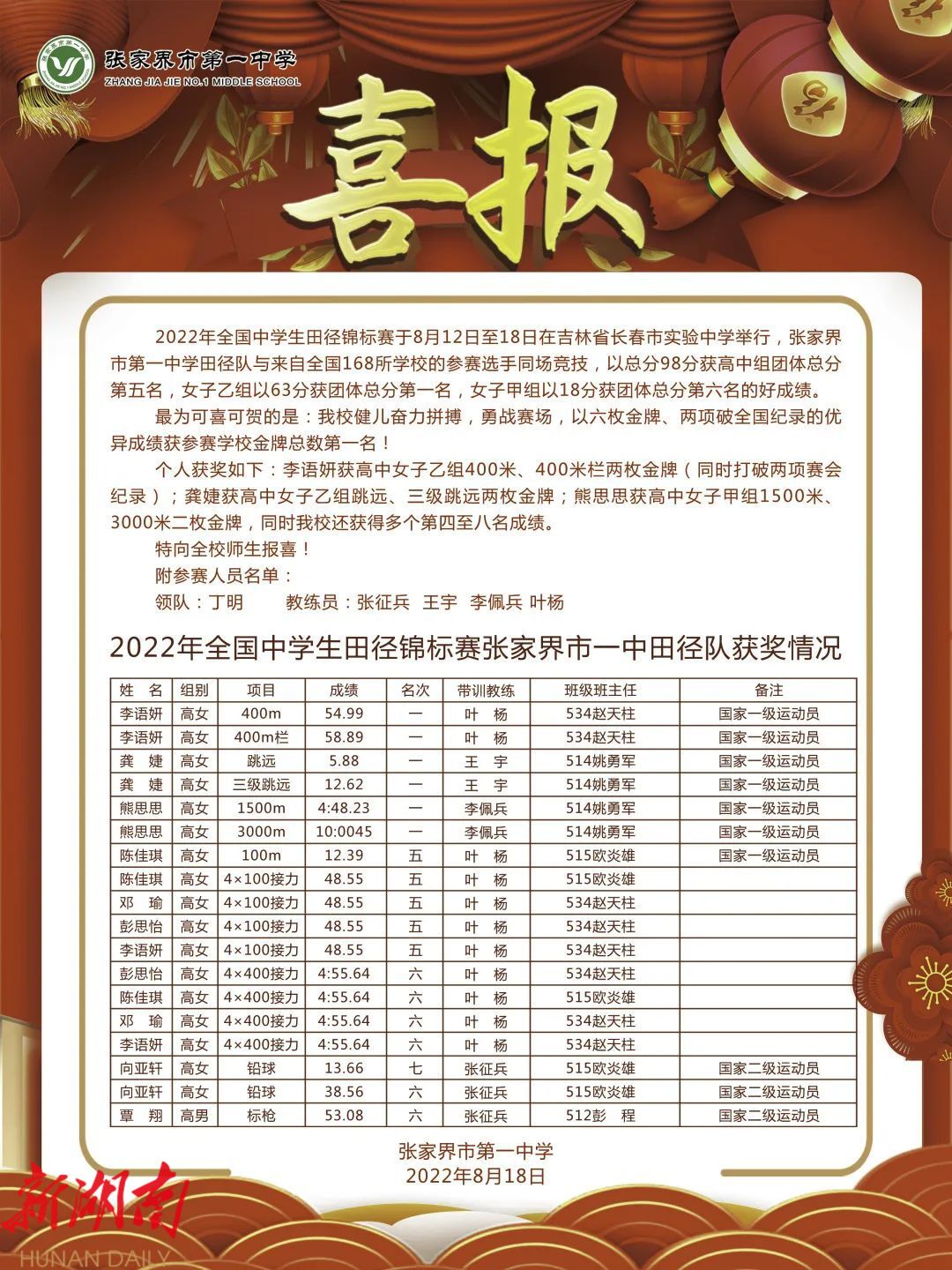 8月15日—8月18日,全国中学生田径竞技最高水准赛事2022年全国中学生田径锦标赛在吉林长春举行。张家界市第一中学田径队再创历史性突破!