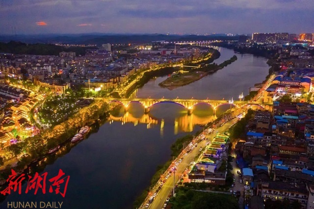 暮色四合,川流不息的车辆人流、鳞次栉比的商城店铺、琳琅满目的大小商品……这是再现“汉唐名郡繁华盛景,楚粤通衢锦绣声色”的“零陵古城”;