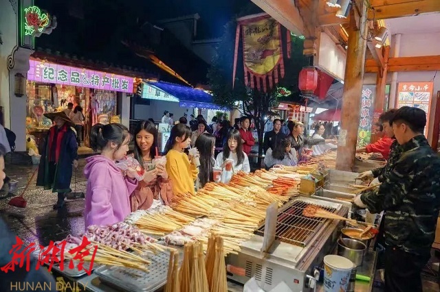 晚上7点,夜色渐浓,零陵古城夜市的霓虹灯逐渐亮了起来,白天原本安静的街道,在此刻像是刚打开的水闸,一股脑涌入此。在熙熙攘攘的街道里,吃的、喝的、玩的、穿的应有尽有。锅中等待翻炒的小龙虾香气扑鼻,烧烤架上的牛肉缓缓舒展开来……游客们悠然地踏着青石板,品尝着炸肉串、烤鱿鱼、水果捞等各色美食,亲身体验各种潮玩、彩绘等项目,无一不享受着这夜晚的惬意和夜宵的“美味”。“平均每天能卖出五百多份,忙得手都停不下来。”一家卖烤肉的店主笑得合不拢嘴。
