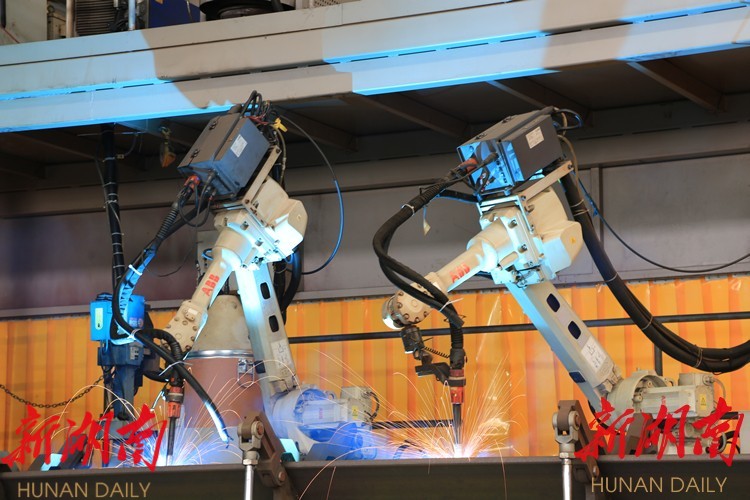 (位于常德高新区的中联重科建筑起重机械有限责任公司,多款塔机畅销全球。图为该公司塔机部件自动生产线。向波 摄)