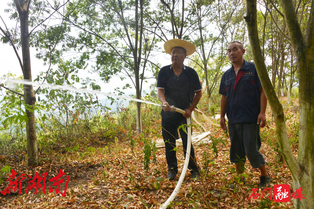 在磨市镇横铺村板栗林,覃海波正在给板栗施水浇灌。由于林地附近没有电源,覃海波购买了发电设备和抽水设备,盛孝前也多次前来对板栗保苗工作进行指导,尽最大努力让种植户的损失降到最低。此次主要是查看苗木保湿情况。“我总共有3000多亩板栗山林,通过盛站长的科学指导,先给树兜底下覆盖杂草,然后再施水,这样给树保湿的时间就比较长,最少能保湿3-5天。”湖南永汇农林科技有限公司董事长覃海波说道。