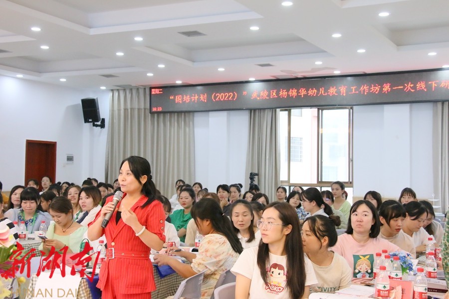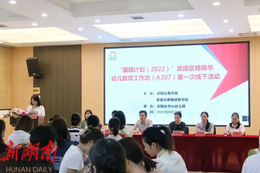 8月30日,来自武陵区区属幼儿园的50名骨干教师齐聚武陵区中心幼儿园,参加“国培计划(2022)”武陵区杨锦华幼儿教育工作坊(A307)开班典礼暨第一次线下研修活动。区教育局副局长黄朝辉、市教师进修学校校长汪珏岑、区教育局学前办主任朱盼来、市教师进修学校师训部主任张丽萍出席本次活动。