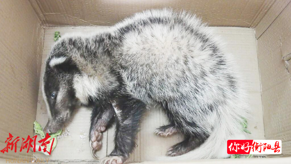 在衡阳县林业局森保站,记者看到一只黑白相间、嘴巴长长的小动物躺在纸箱里,当时发现它的人还给它准备了一些白菜叶子,它外表看起来没有明显的伤痕,但是站立困难,有些许害怕。