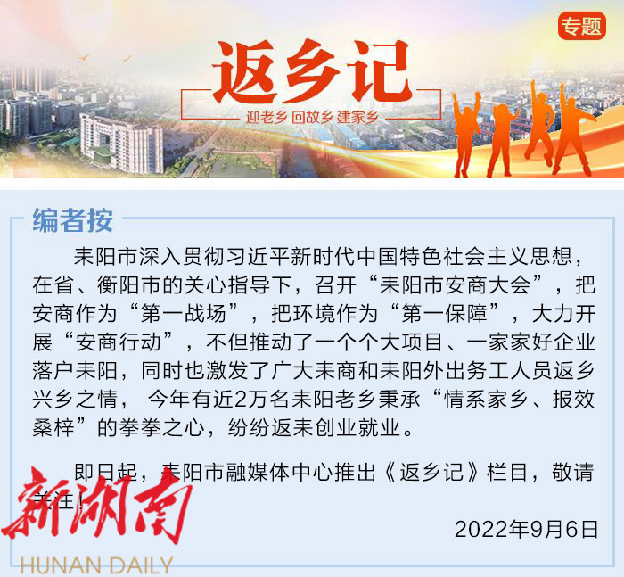 “近几年,家乡的变化日新月异,这些可喜的变化在环境、在人、在精神风貌上都有体现,我们看得见、摸得着、切身感受得到。”吴孝宝笑着告诉记者说,“乡情是纽带,家乡极具潜力的后发优势让我更加肯定,先导在耒阳定有大番作为。”