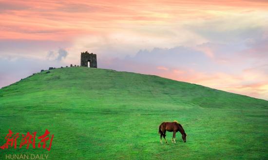 仰天湖大草原。马儿正在草原上漫步,晚霞成为迷人的背景板。图/景区提供