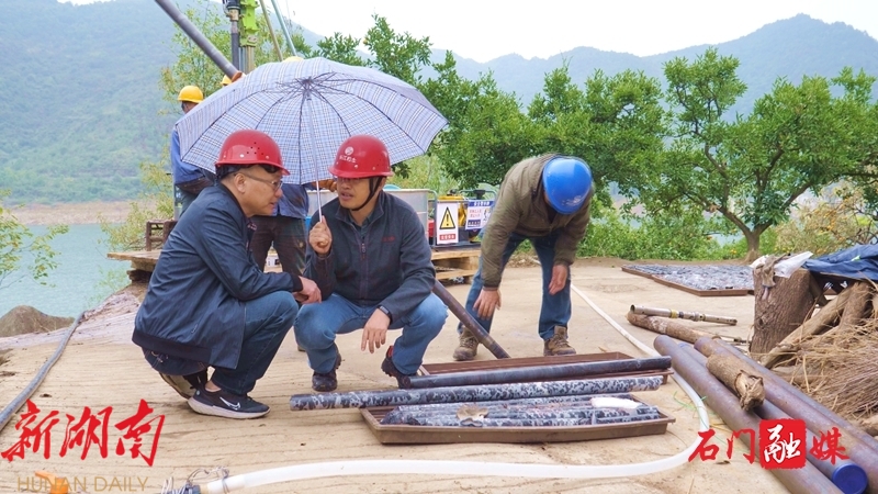 走进皂市镇女仙桥村,记者看到,现场机器轰鸣,技术人员正在进行钻孔钻探工作。石门抽水蓄能电站勘察项目总工罗仁辉说道:“目前我们正在进行项目的预可研阶段勘察工作,已经完成两个钻孔,主要是尾水隧洞地下洞室的钻孔,径尺完成了300多米,钻出来的岩芯非常完整,比我们预想的情况要好。下一步我们打算进行上水库的大坝及库盆的勘察工作。”