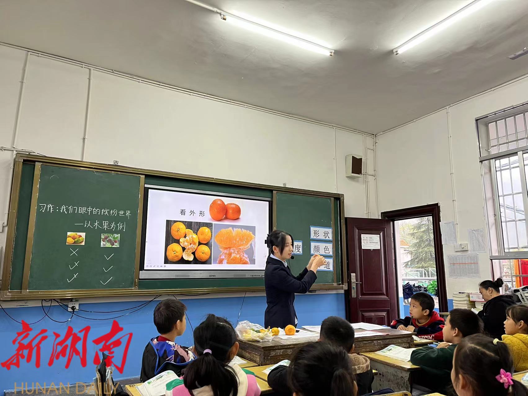 “今天上课的时候,老师带来了许许多多的橘子,让我们观察。我观察到了橘子的外形从正面看是圆圆的,从上往下看又是扁扁的,看上去像一个可爱的小南瓜……”一个学生分享了她的习作,她说通过老师的指导,自己观察到了更加具体的内容,并通过自己手下的笔去呈现自己观察到的东西,这样的感觉很奇妙。