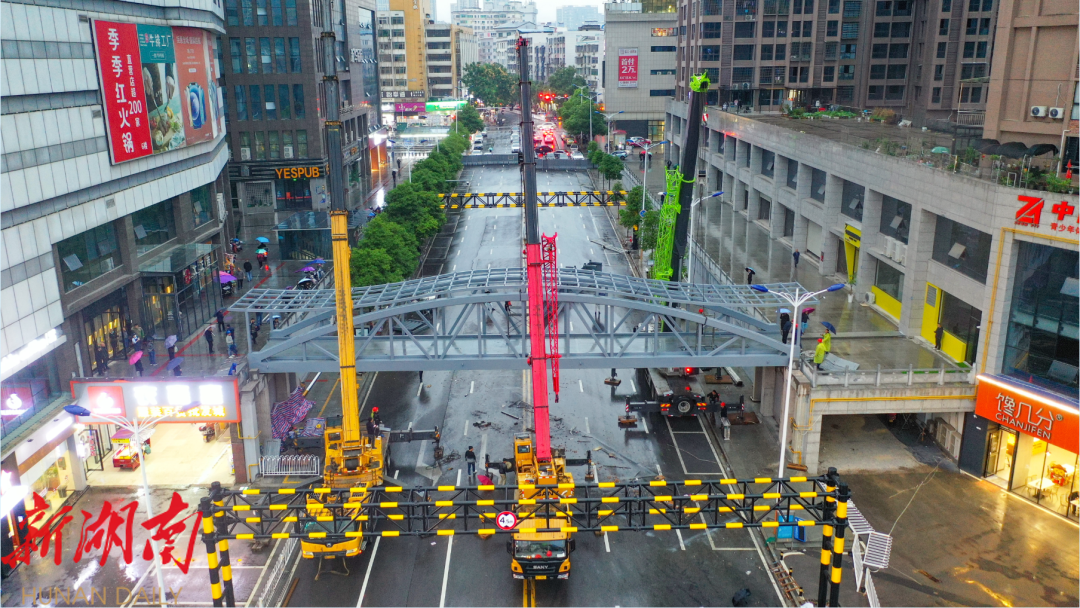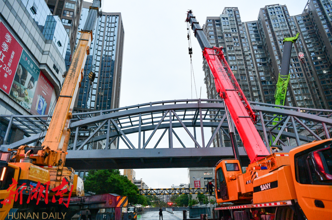 “起吊!”10月27日下午5时20分许,在北正南路与浏阳河路交叉路口,随着施工人员的一声口号,3台吊车同时运作,一座人行天桥桥面缓缓升至半空。约10分钟后,在吊车驾驶员的精准操作下,桥面稳稳地落在了九方北正西购物中心与鸿宇城二期之间,这标志着浏阳城区首座人行天桥正式吊装完毕,预计于11月8日全面完工、投入使用,届时居民出行、购物等便利度、安全性将得到极大提升。