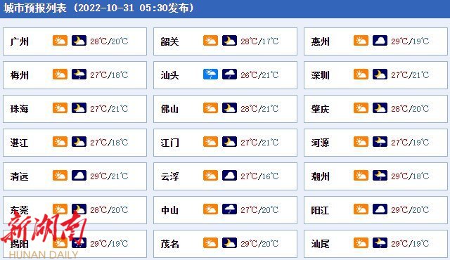 31日,粤东市县多云有阵雨,其余大部分市县晴到多云。最低气温:南部市县21~24℃,粤北市县15~18℃,其余市县18~22℃。