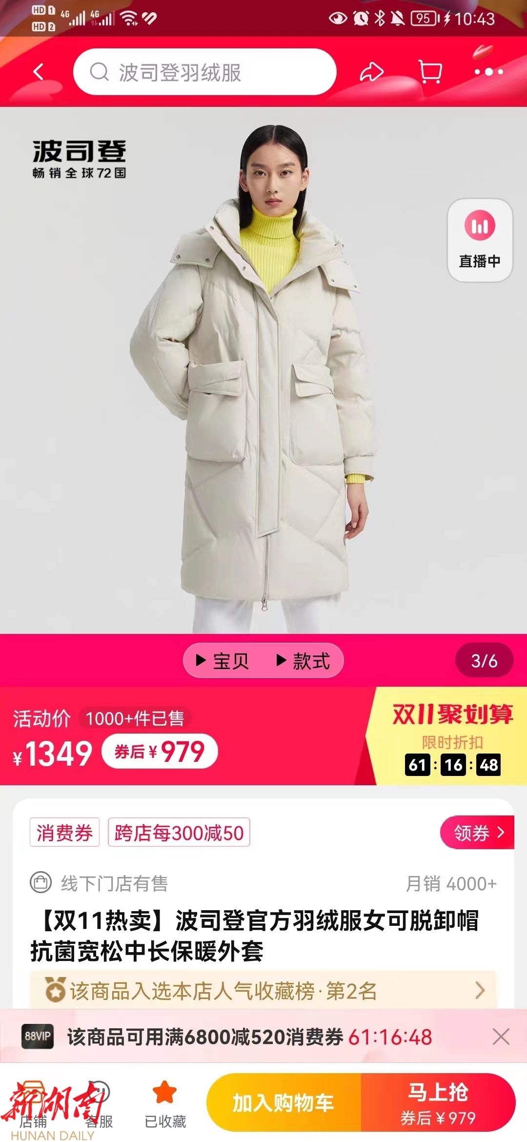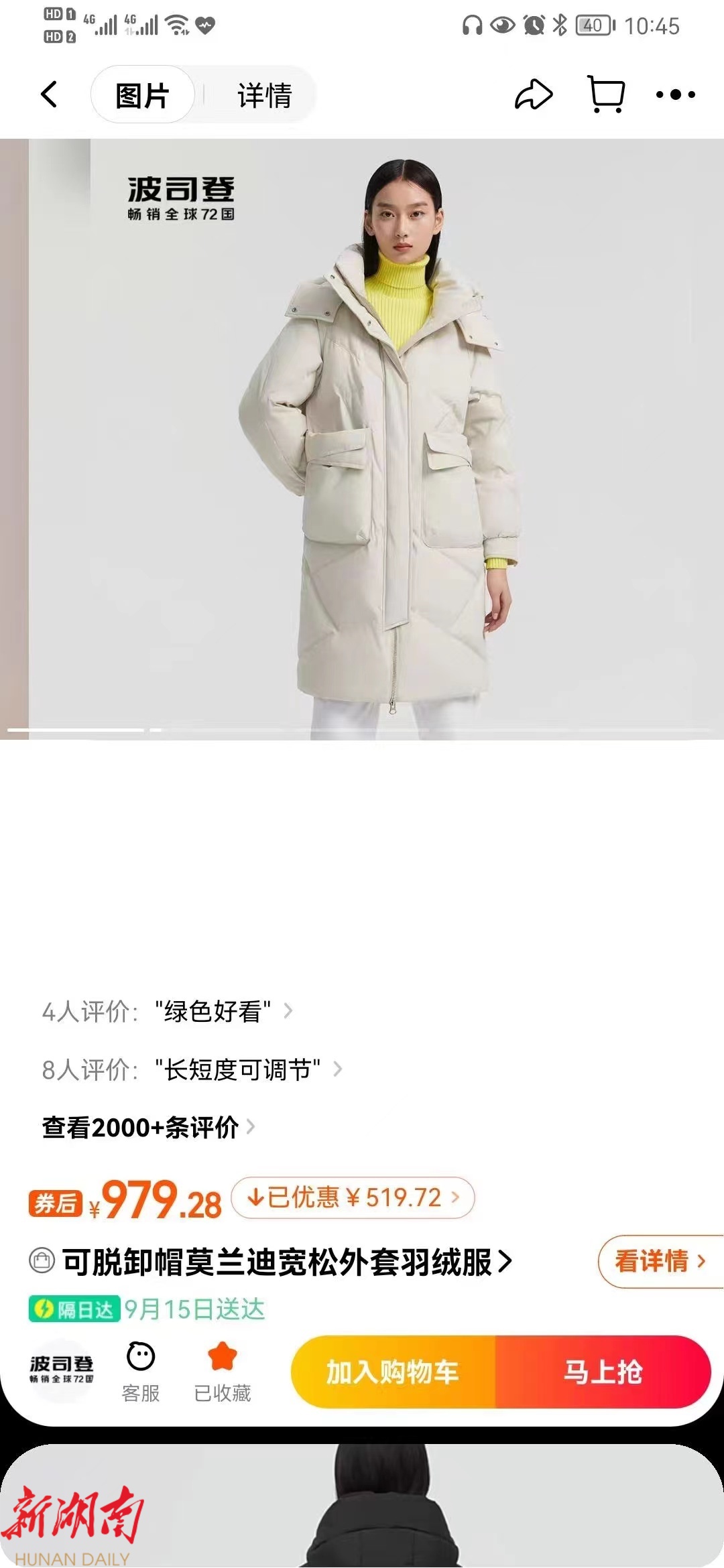 另一位来自上海的市民李女士向澎湃新闻爆料,双十一预售期间,她原计划在淘宝波司登旗舰店购买一件可脱卸帽莫兰迪宽松外套羽绒服。她称这件外套在9月份时,平台的价格是券后979.28元。本来她计划在双十一时打折时购买,没想到在双十一预售期间,该款羽绒服的价格提升至1349元,领券购买后实际价格仍为979元。