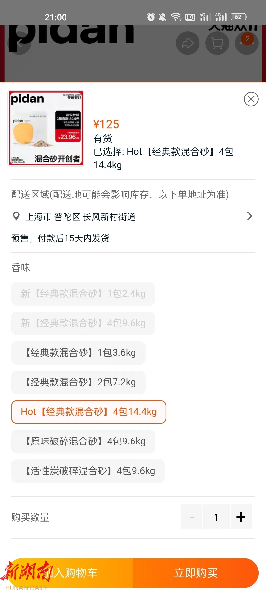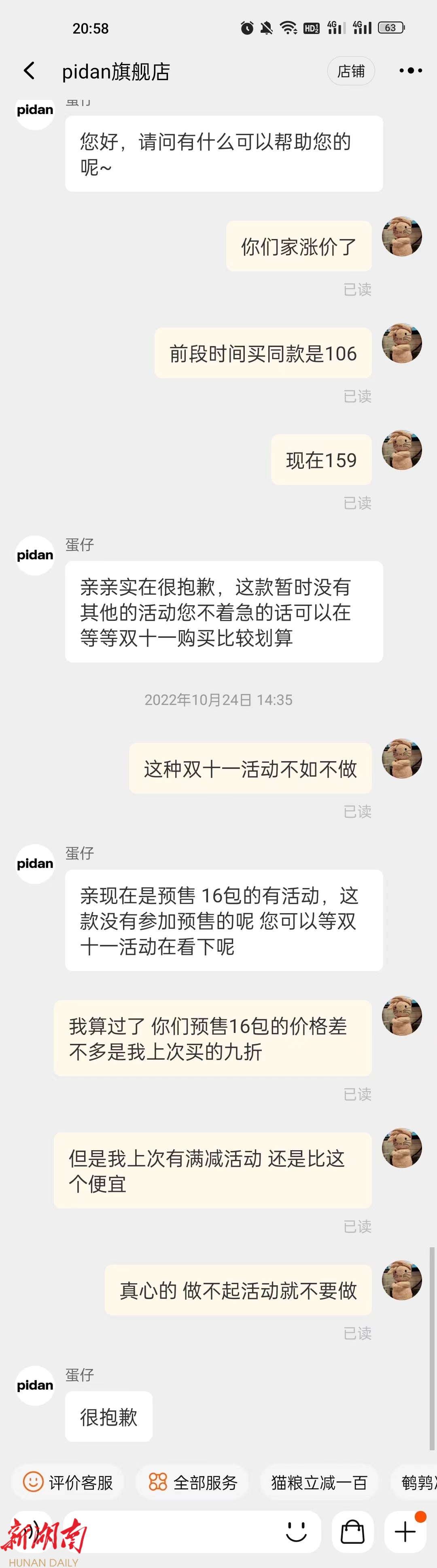 11月5日,消费者王女士告诉澎湃新闻记者,双十一预售时,她曾在淘宝平台pidan旗舰店里看中了一款猫砂,前段时间同款猫砂的价格是106元,但后来突然调整至159元。“客服的回复称是活动变了,这款猫砂暂时不参加预售。我跟他们客服反映了调价的问题后,他们又将价格改为125元。这样相当于还是涨价了。”王女士称。