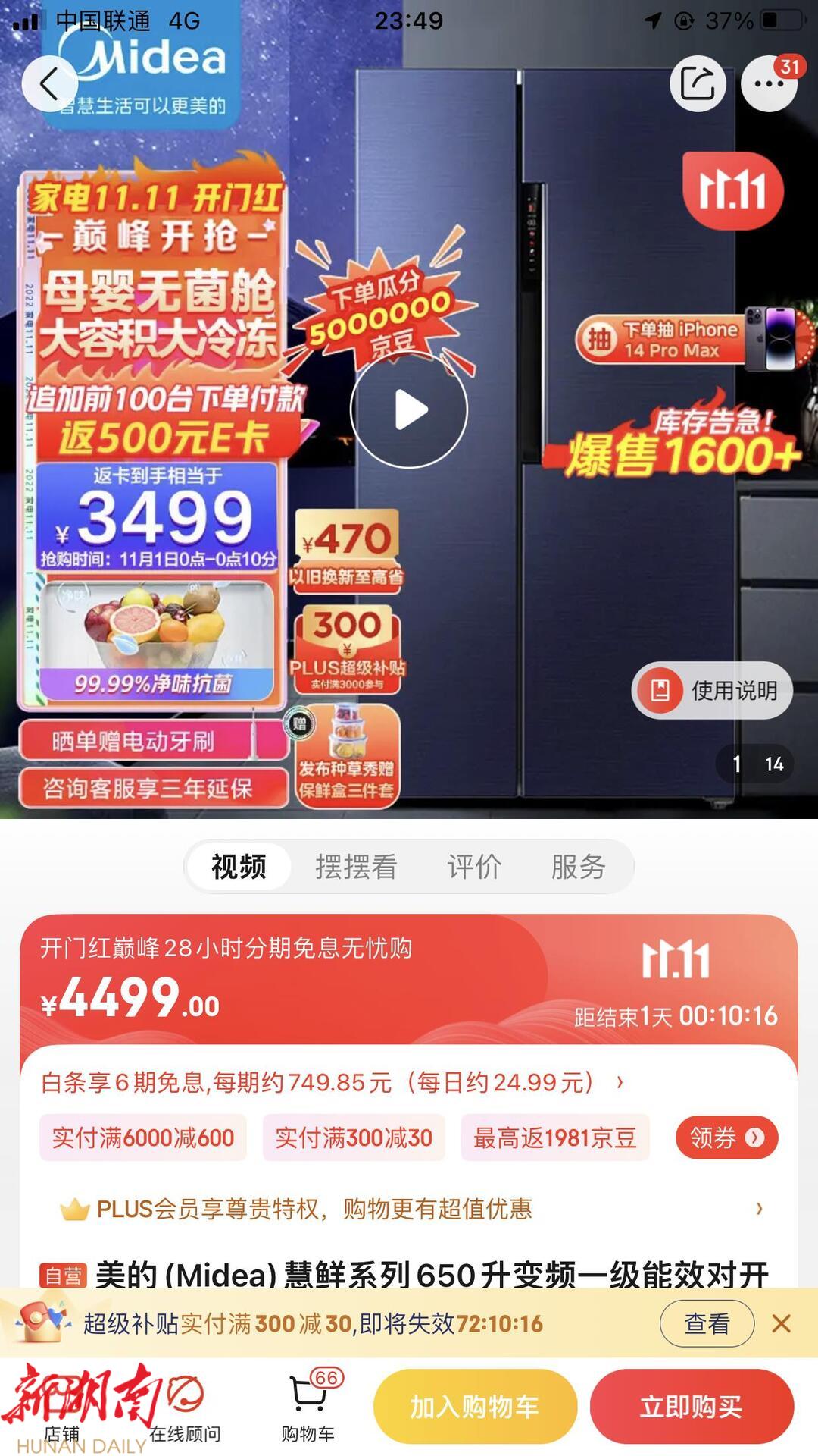 吉米反映冰箱价格突然又返回到4499元,最后到手价为3499