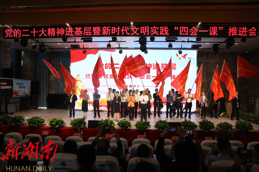 石鼓区是新时代文明实践中心全国试点区,探索了“志在石鼓”新时代文明实践试点新模式,该区运用新时代文明实践“四会一课”载体推动党的二十大精神进基层,打通了宣传宣讲“最后一公里”。在现场,石鼓区分享了以新时代文明实践“四会一课”活动推进党的二十大精神进基层的做法。衡南县、南岳区等12个县市区、高新区、松木经开区接授“新时代、新思想、新征程、党的二十大精神进基层宣讲团”旗帜后,纷纷表示,将结合实际,创新举措,开展形式多样、丰富多彩的“四会一课”活动,用最鲜活、最接地气的方式,向广大人民群众宣讲党的二十大精神,推动党的创新理论深入人心、落地生根。