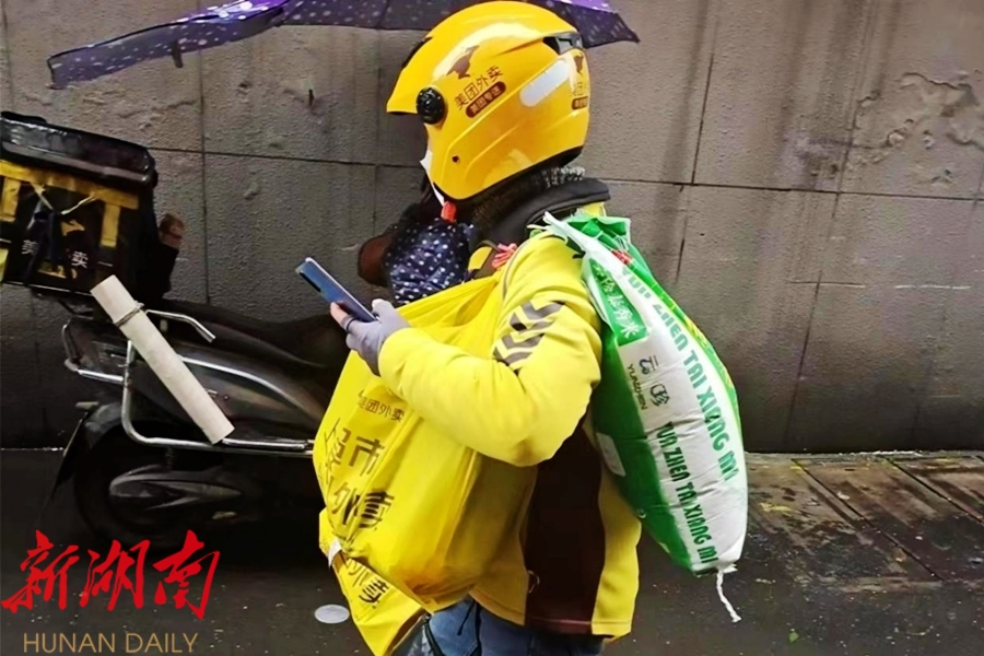 “电力局有一单要粮油物资的,我取好了马上去送。”王小纯骑着摩托车来到好润佳超市万和店仓库。打包员事先准备好的物资包已整齐摆放在取货点,王小纯依单点数,然后一个起身,将米袋甩搭在肩上,扛到了50米开外的摩托车上。