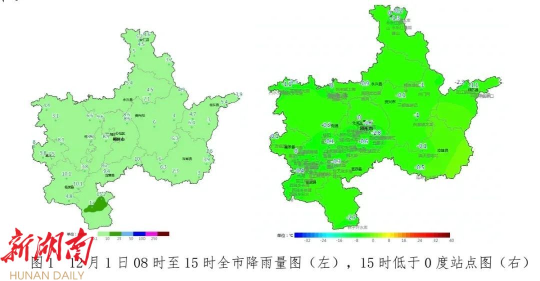 11月30日晚开始,我市部分海拔较高的山区出现雨夹雪和轻度冰冻 。12月1日中午时段,我市嘉禾、桂阳、北湖、苏仙、资兴等中部一线出现雨夹雪天气 ,其他县市以小雨为主,局地中雨,最大降雨量为宜章县天塘17毫米。12月1日15时,全市平均气温0.5°C ,全市气温在零下5°C(北湖区鲁塘镇太山里<海拔1150米>)至 6.6°C(汝城县九龙江森林公园<海拔278米>)之间,有 69个区域自动站气温在0°C以下。