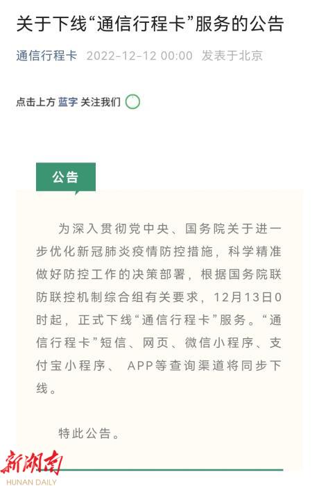 此前一天,12日凌晨,中国信息通信研究院发布公告宣布“通信行程卡”服务将于12月13日零时起正式下线。“通信行程卡”短信、网页、微信小程序、支付宝小程序、APP等查询渠道将同步下线。