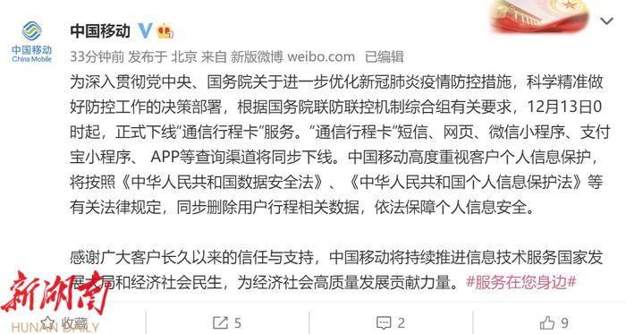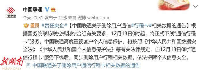 记者注意到,12月12日,中国电信、中国联通、中国移动三大运营商相继表示,将按照《中华人民共和国数据安全法》、《中华人民共和国个人信息保护法》等有关法律规定,自12月13日0时“通信行程卡”服务下线后,同步删除用户行程相关数据,依法保障个人信息安全。
