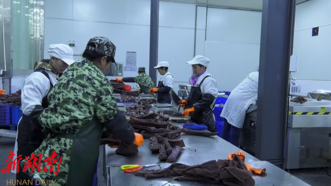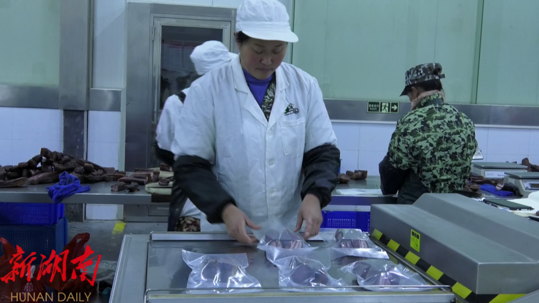 湖南鑫科牧业员工、米多村村民田春香笑盈盈地告诉记者,“我每个月工资有三千多元,平时工作主要就是做腊肉的包装,又不累。离家里近,又能带孩子又能挣钱,又可以照顾老人。”