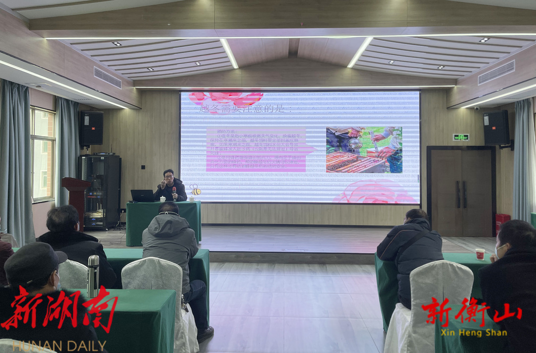 衡山县融媒体中心12月20日讯【记者:戴玮 文雅婷 苏正杰(实习)】12月20日,由衡山县科技专家服务团举办的养蜂技术培训班正式开班,为衡山蜂业协会会员、新型农业经营主体带头人等共计50余人进行授课。