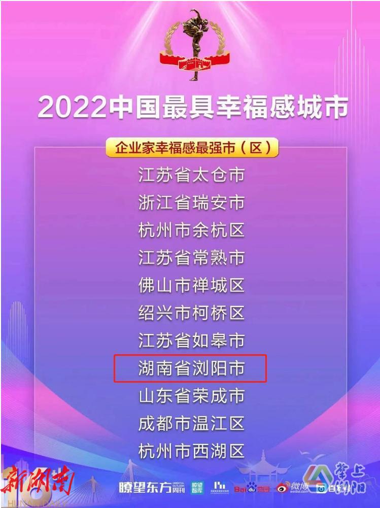浏阳市融媒体中心12月21日讯(记者 陈郁琳)12月21日,2022中国幸福城市论坛在杭州举办,现场发布了2022年度中国最具幸福感城市系列榜单,浏阳获评“企业家幸福感最强市(区)”。