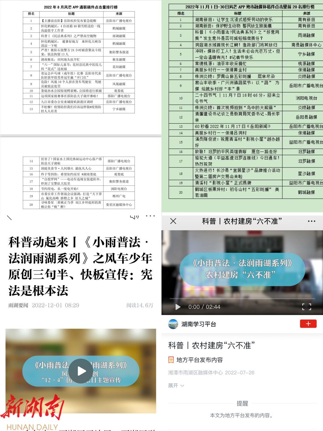 《小雨普法·民法典系列》之严禁高空抛物短剧点击量在2022年8月风芒APP地市融媒体稿件中排名前3;《小雨普法・民法典系列》之“好意同乘”发生意外是否可减轻赔偿责任?短剧点击量在2022年11月风芒APP地市融媒体稿件中排名前3; 新湖南APP发布的《小雨普法・法润雨湖系列》之风车少年原创三句半、快板宣传:宪法是根本法短片单条点击量达14.5万 ……