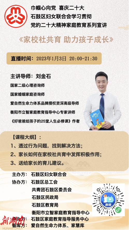 2023年1月3日晚20点,石鼓区家庭教育指导线上课堂即将开课啦!由国家二级心理咨询师、国家婚姻家庭咨询师、衡阳市立智家庭教育指导中心专家讲师刘金石,讲授《家校社共育 助力孩子成长》,与大家分享家长如何在家校社共育中发挥积极作用,教育出赢在未来的孩子!扫码好课约起来!@所有人