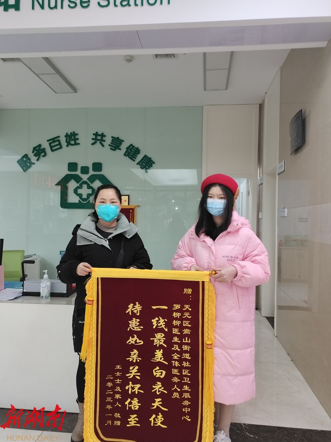 1月4日一早,天元区嵩山街道社区卫生服务中心上演了温馨的一幕。患者王女士将一面写着“一线最美白衣天使,待患如亲关怀倍至”的锦旗,送到了发热门诊罗柳柳医生手中,以示感谢。