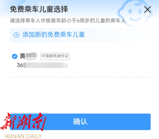 首先,在铁路12306APP上将免费乘车儿童添加为乘车人。