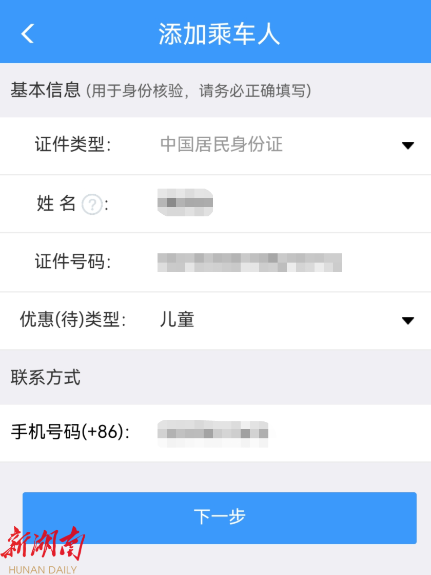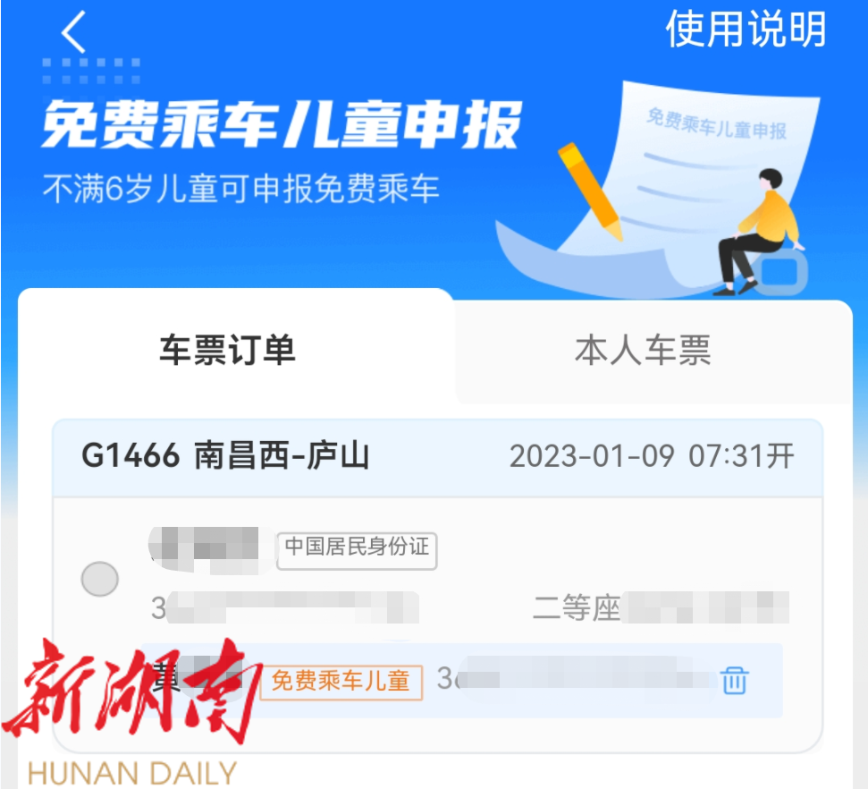 按顺序点击“我的”—“乘车人”—“添加”,按提示输入免费乘车儿童的姓名、证件号码、联系方式等信息,即可添加成功。