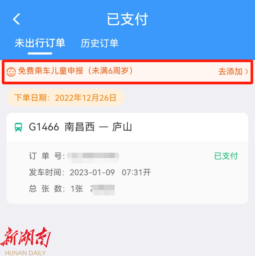 用户购票完成后,在铁路12306APP中的“火车票订单”或“本人车票”中进行免费乘车儿童申报操作。