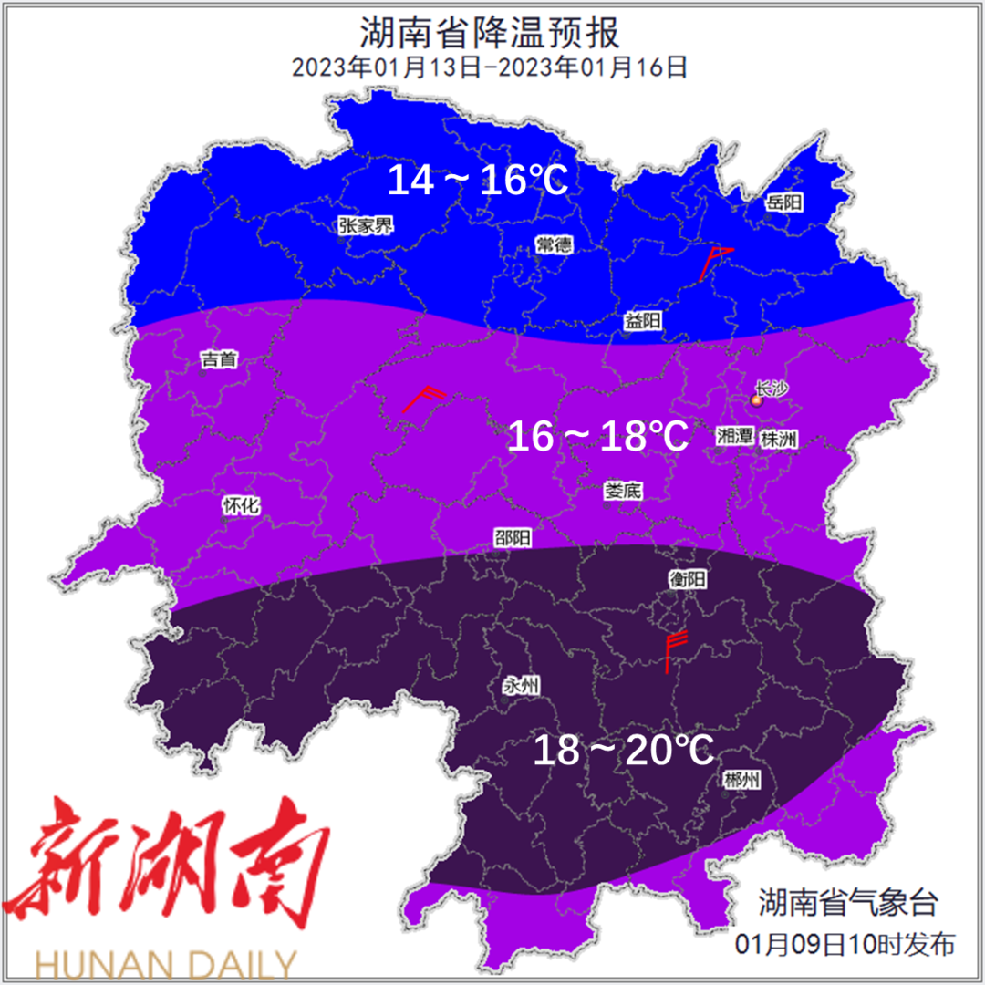 未来一周前晴后雨,气温前高后低变幅大,14日至15日省内有一次寒潮大风雨雪天气过程。 9日至10日,大部分地区以晴天间多云天气为主,湘南局地有阵雨,湘北、湘中有中到重度霾;11日至12日,大部分地区有分散性阵雨或雷阵雨;13日降雨加强,湘北、湘中有中等阵雨或雷阵雨,局地大到暴雨,并伴有短时强降水、雷暴大风等强对流天气;14日至15日受强冷空气影响,自北向南有一次寒潮大风天气过程,风力普遍加大至5~6级,平均气温下降14~18℃(图1),最低气温-1℃左右(图2),其中14日晚至15日大部分地区有雨夹雪或纯雪。