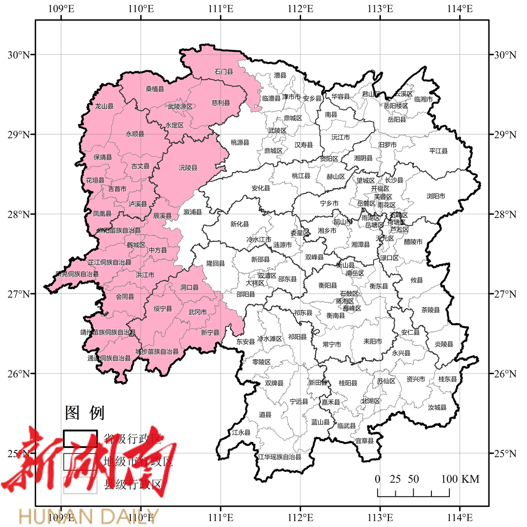 湘西地区: 邵阳(洞口、绥宁、新宁、城步、武冈)、常德(石门)、张家界、怀化(鹤城区、中方县、沅陵、辰溪、会同、麻阳、新晃、芷江、靖州、通道、洪江)、湘西州。