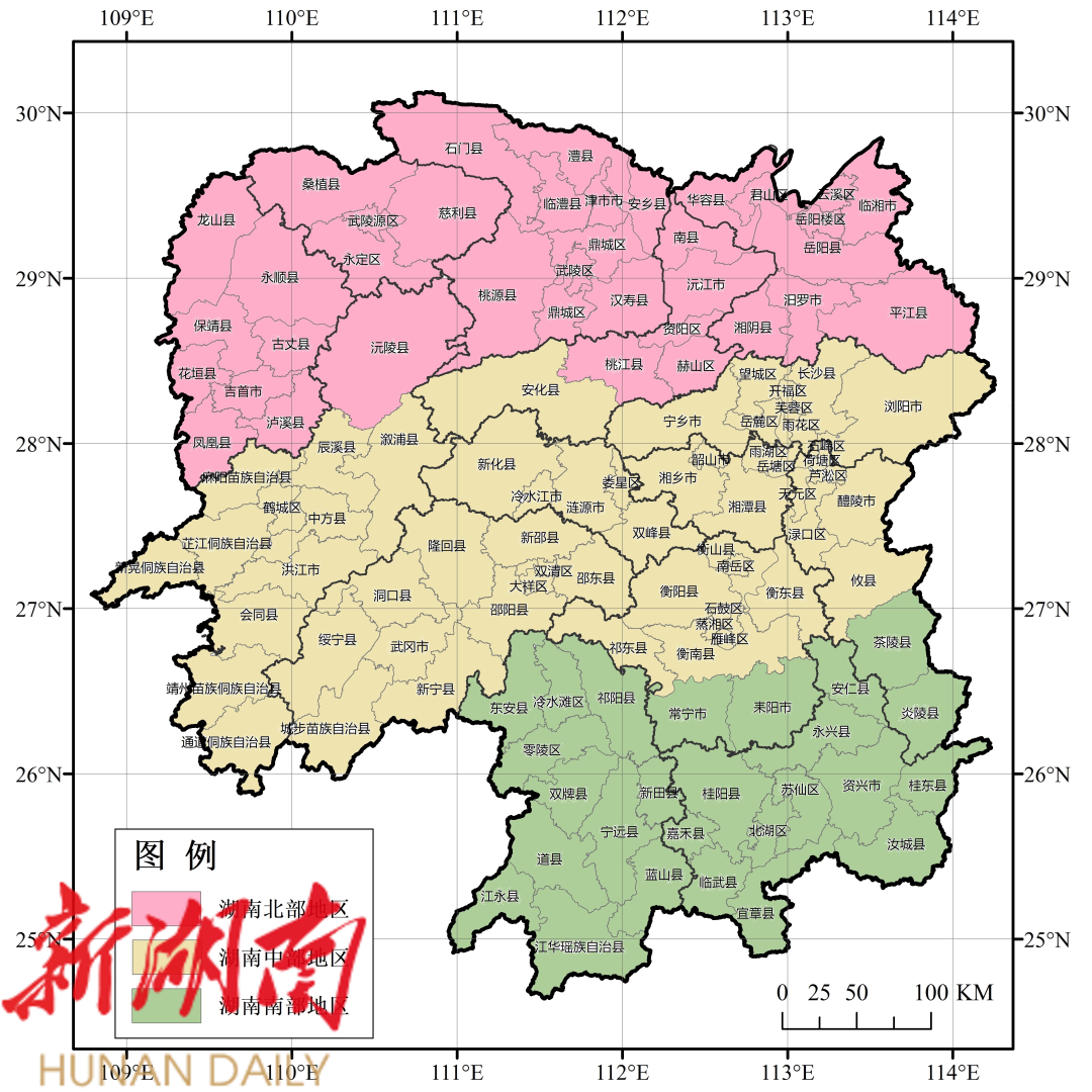 湖南省气象地理区划图(湘北、湘中、湘南)