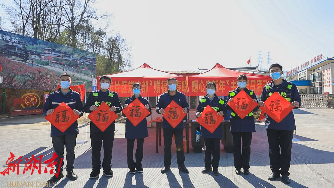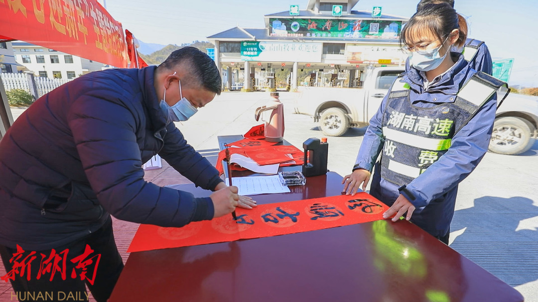 在儒林高速公路出入口,城步收费站工作人员把美好的祝福倾注笔端,现场书写新春对联和“福”字,向来往司乘人员送上红糖姜茶和新春对联,现场洋溢着欢乐吉祥的新春氛围。